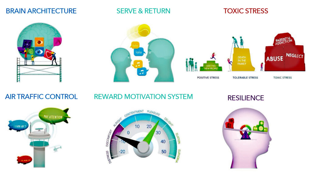 A key focus of this work has been creating shared language and understanding so that professionals from different disciplines can work together more effectively to support the individuals, families, and communities they work with. Through partnerships with the Center on the Developing Child at Harvard University, the National Scientific Council on the Developing Child, and the FrameWorks Institute, AFWI has mobilized knowledge on brain development using six simple metaphors collectively known as the Brain Story, to share this information in understandable language across settings and sectors (See image below).
