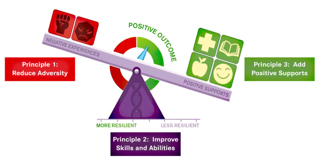Resilience is our ability to adapt and stay healthy, even when facing tough circumstances. The Scale shows how three different factors influence our capacity for resilience: negative experiences, positive supports, and skills and abilities.